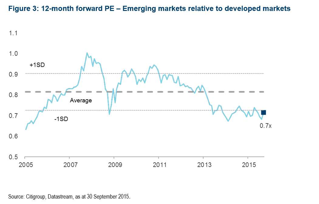 Yet fast-forward to the summer of 2015 and sentiment towards emerging markets has shifted markedly following three years of weak performance and depreciating currencies. Over the three years to August 2015, the MSCI World index has delivered a total return of 45% in sterling terms, whilst the MSCI Emerging Markets index has fallen by 3%.